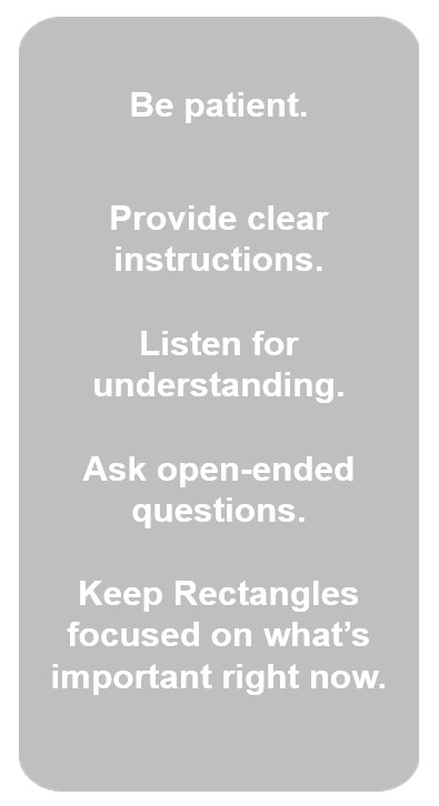 The Rectangle at work could be someone with years of job experience, but still a new employee at your company during the onboarding process. It could be a new team member, at any age, who has just moved to your city, state, or country. Experiencing a Rectangle phase in your life doesn’t mean you are new at everything, it just means you are at a new or different turning point in your life. The Rectangle could also be a recently promoted boss, co-worker, or direct report, or a co-worker who just got married, had a baby, got divorced, became an empty nester, is caring for an aging parent, or has experienced a personal injury that has caused a change in their routine, or grieving the loss of a loved one. The Rectangle can be any of these people, including you, when experiencing change.